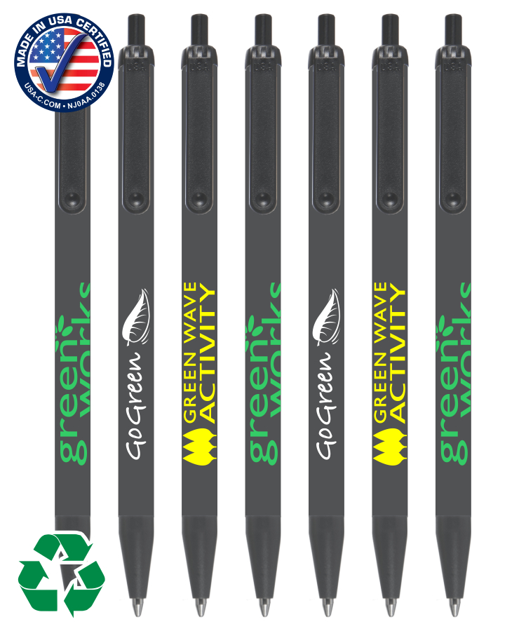 Certified USA Made - Recycled All Black - Plastic Click-A-Stick Pens with Pocket Clip