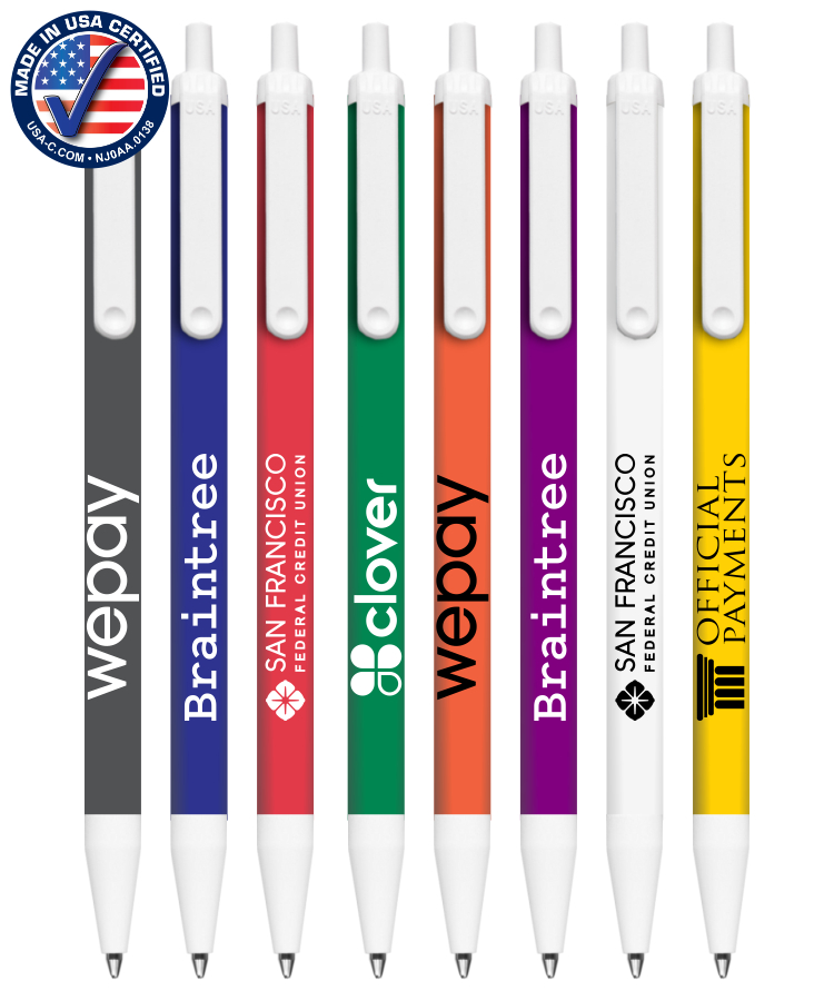 Union Printed - USA Made - White Trim - Click-A-Stick Pens with Pocket Clip - 1-Color Logo
