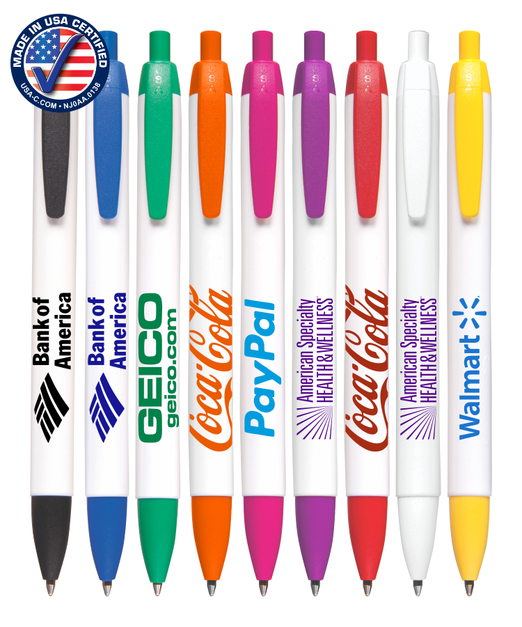 Union Printed - USA Made - Wide Body White Click Pen with Colored Trim - 1-Color Logo