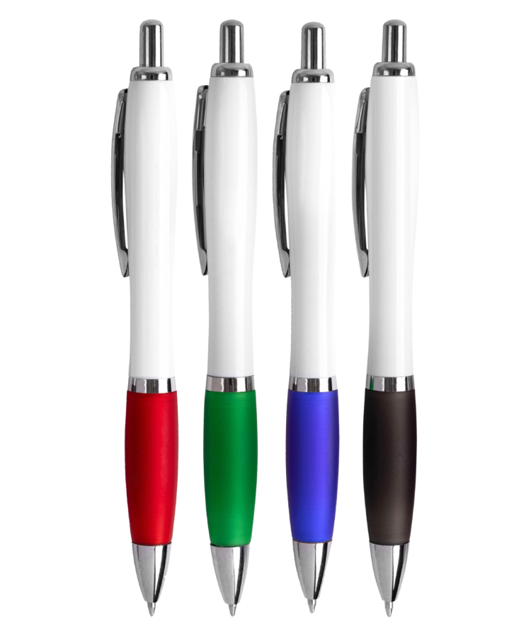 • The Rio Retractable White Click Pen features a sleek curved white barrel, vibrant color grip, and polished chrome accents for a clean, modern look.