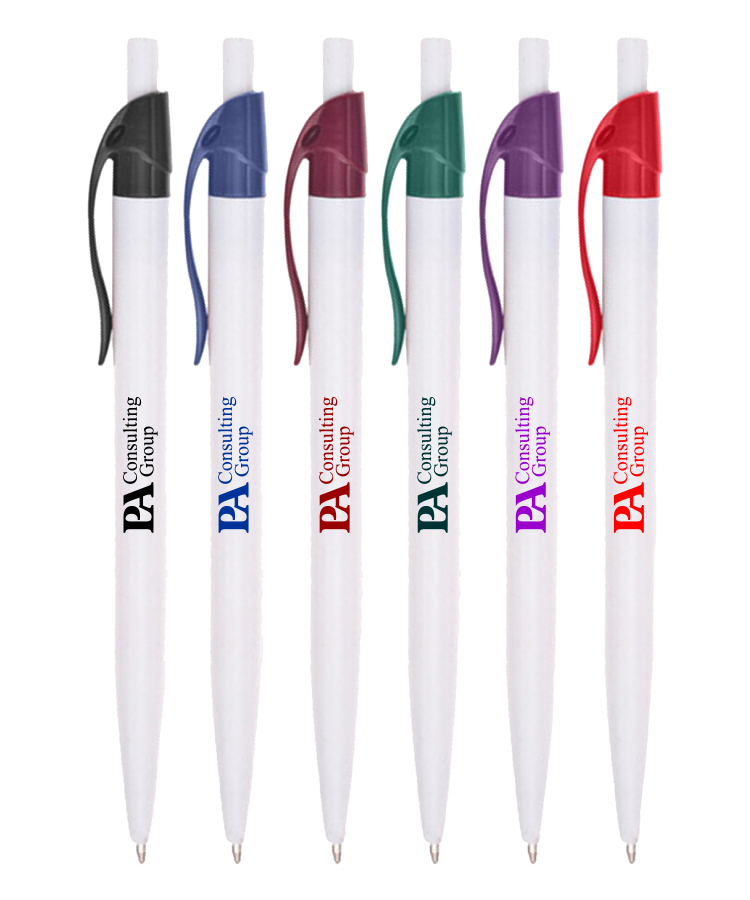 - Featuring a sleek retractable click design, this pen combines a colored barrel with clean white trim for a modern look.