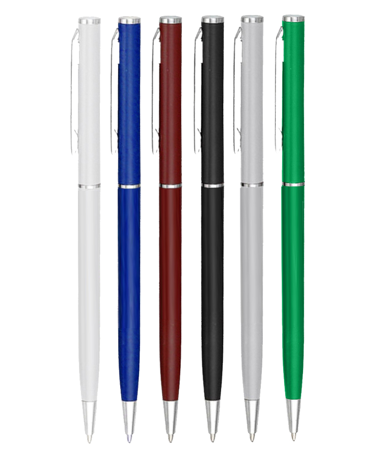 - A slim, metal look plastic pen with a twist-action mechanism.