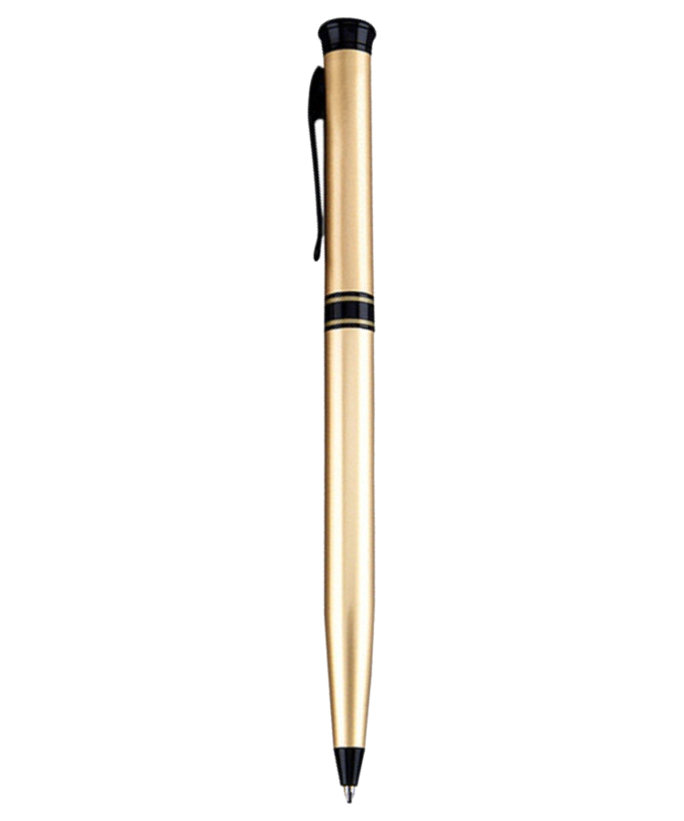 - A premium twist action pen crafted from solid brass, featuring a metallic gold barrel accented with striking black trim for a bold, refined look.