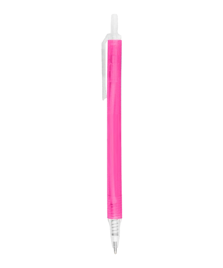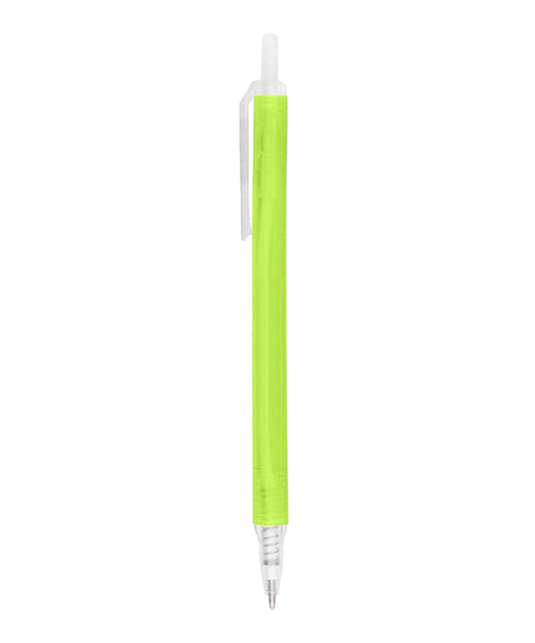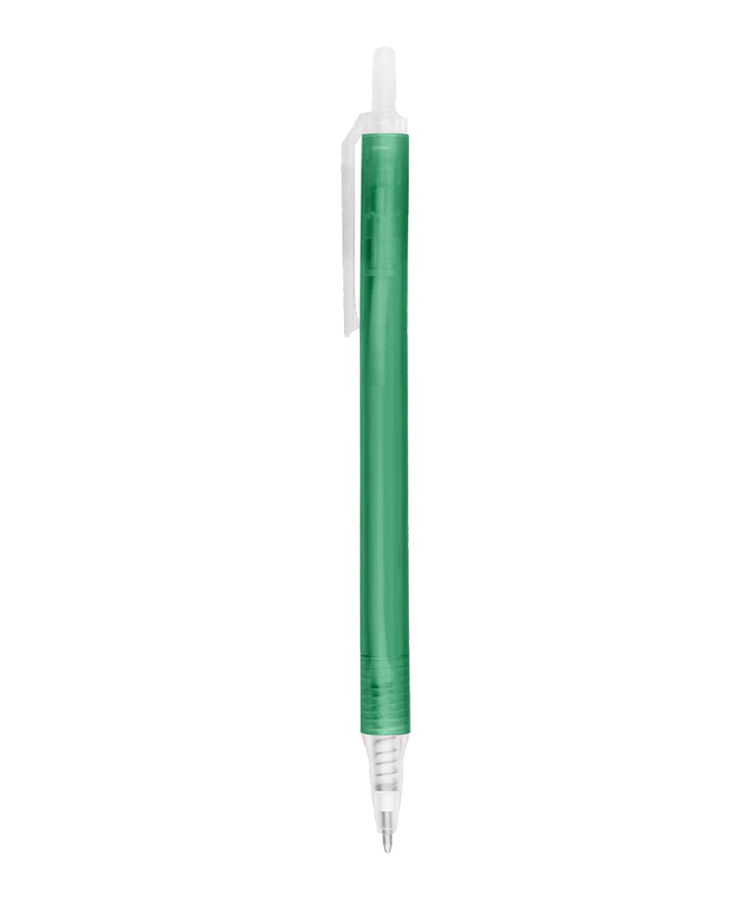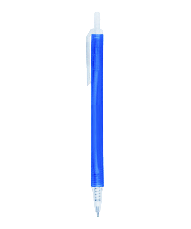 • A simple, affordable stick pen with a frosted translucent barrel and matching trim.